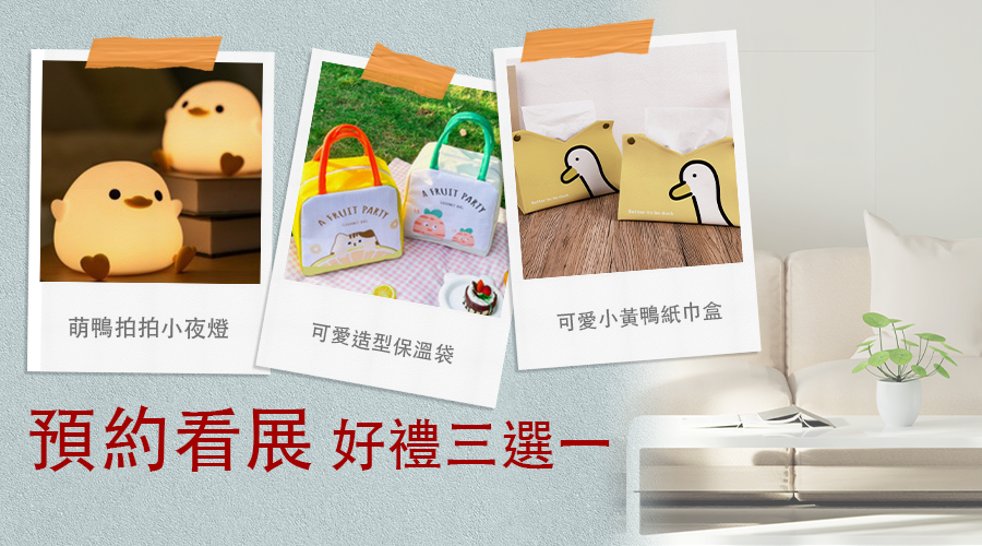 凡於展前網路預約看展完成報名後,於贈品兌換時間:12:00~18:00,憑本人身分證明文件正本,即可於活動期間至『新北市鶯歌家具名床曁智慧家電影音大展』大會贈品處,兌換「萌鴨拍拍小夜燈、可愛造型保溫袋、可愛小黃鴨紙巾盒」好禮三選一乙份.